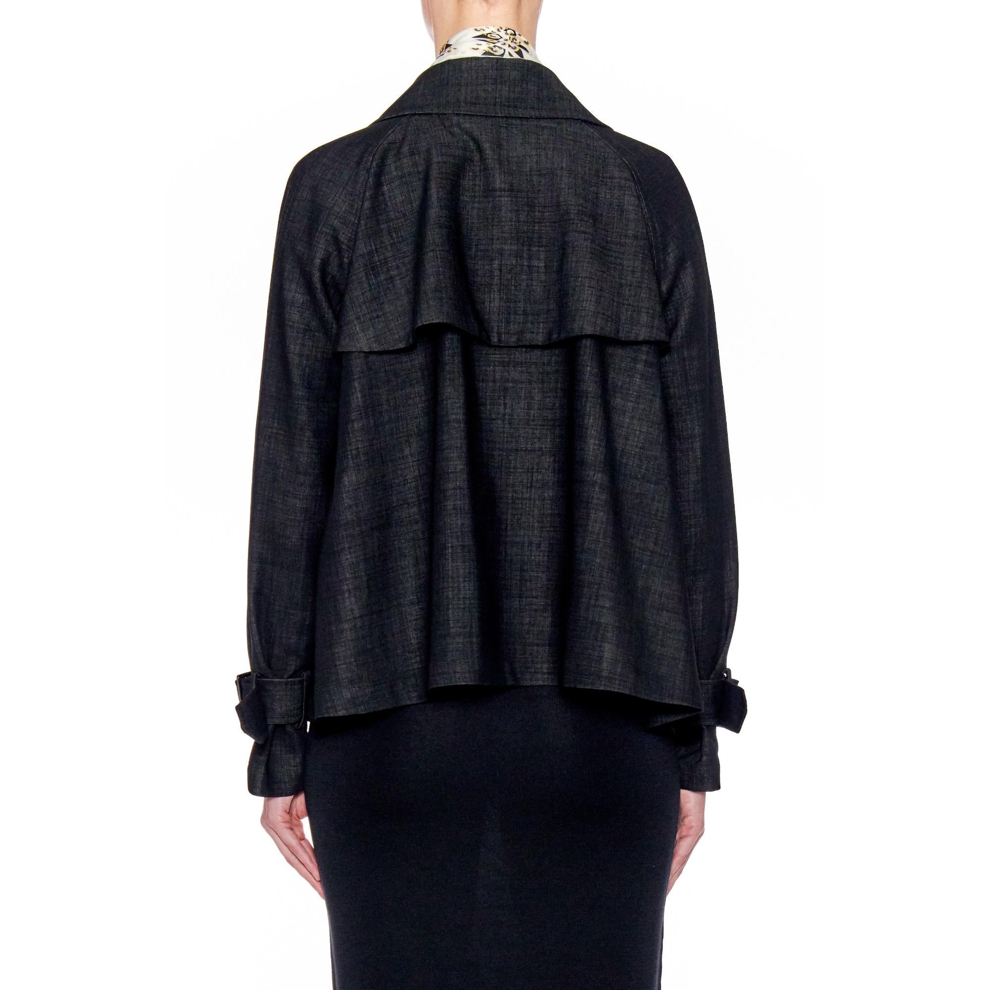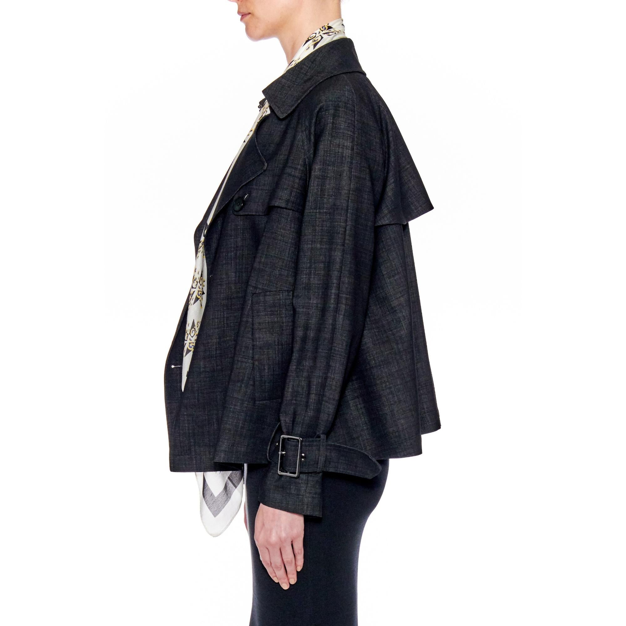 Short ultra light tailored trench jacket made with a double sided cotton/wool blend in black. Beautifully detailed with belted cuffs, natural buttons and storm shield details. The short and modern silhuette is finished with tonal binding and unlined raglan sleeves.Layer this short and feminine jacket over your outfit to look cool but keep out the chill.