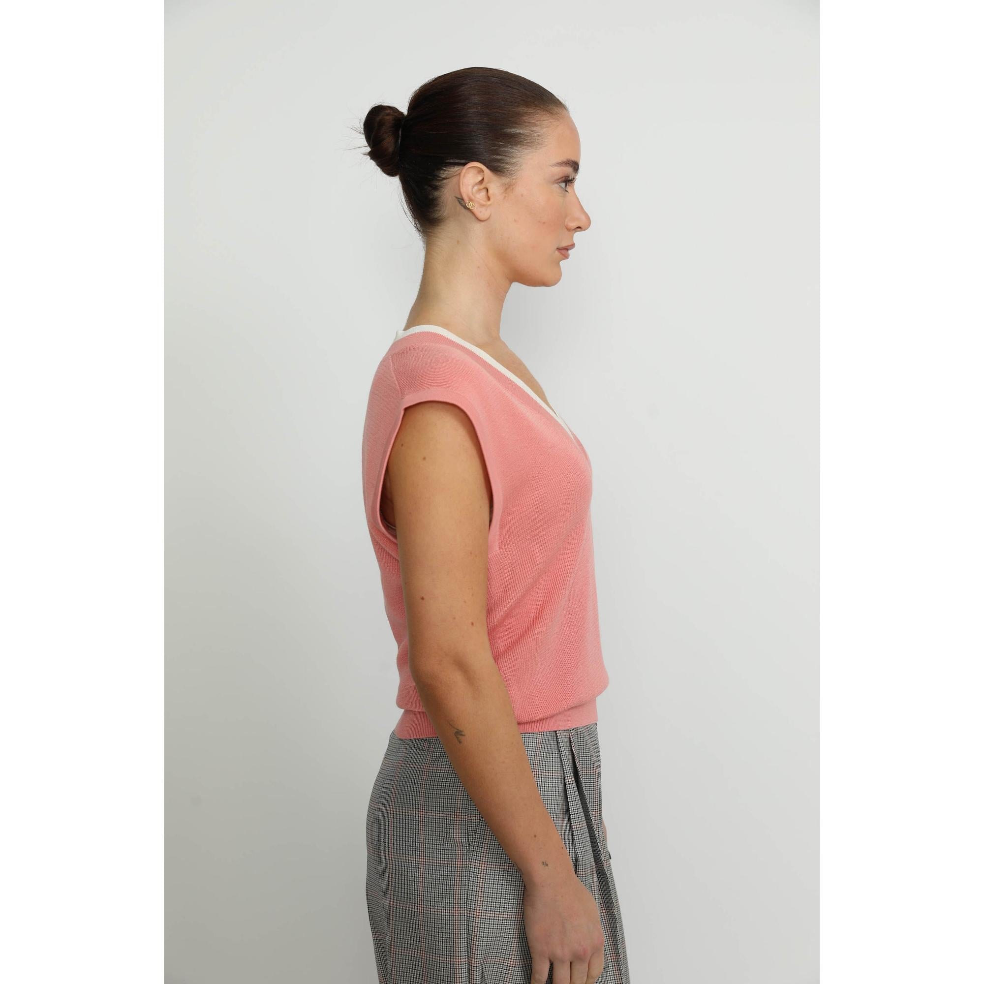 V-neck blouse in a pink/white textured cotton blend. This blouse combines style and comfort with its ribbed V-neckline and oversized, loose fit. The ribbed hem adds a touch of sophistication, making it a versatile piece for your spring/summer wardrobe.